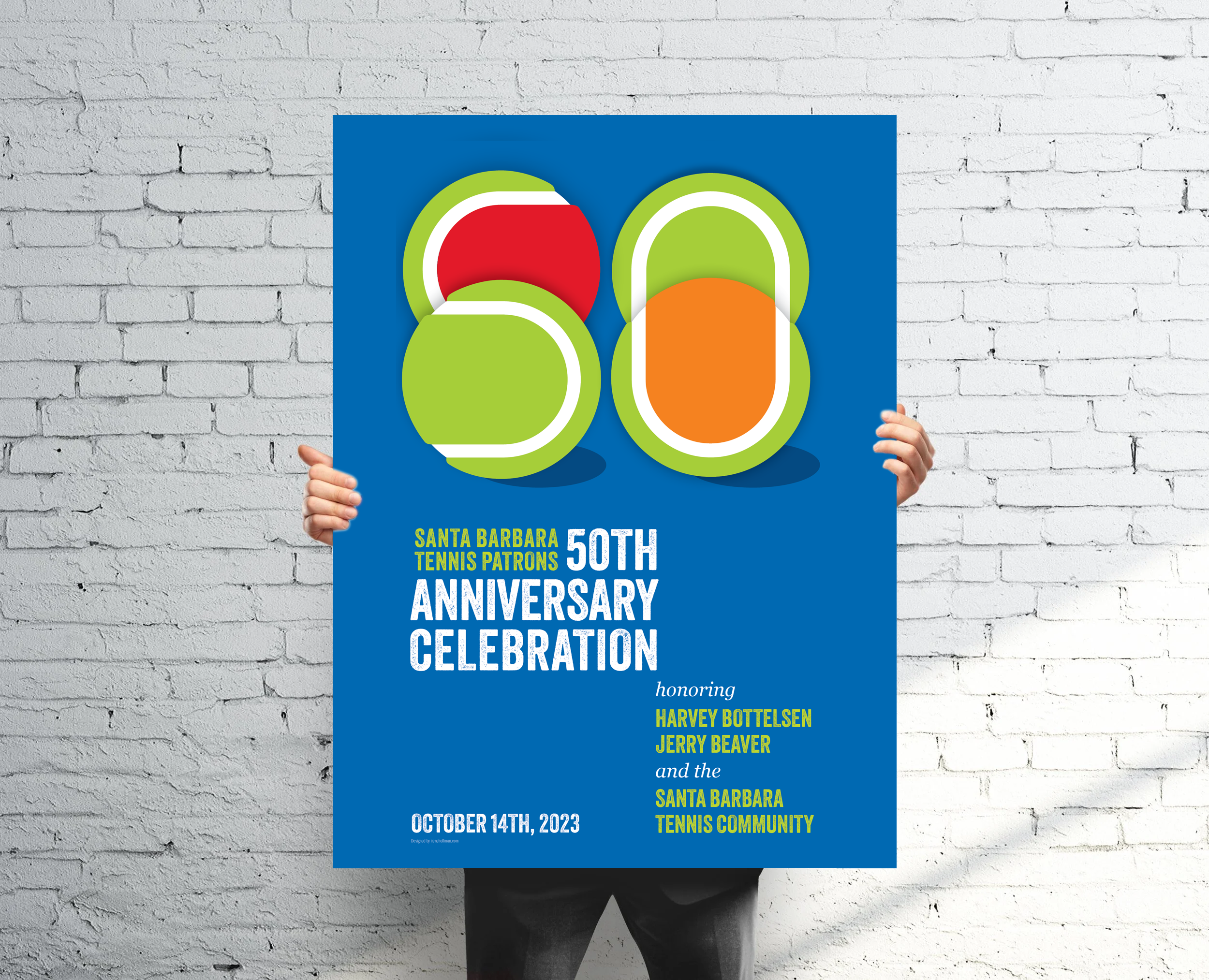 I learned there are different balls for children – they start with a very soft ball (red), them move on to the orange ball, and then the green. This formed the basis for the concept celebrating this non-profit whose mission is to promote tennis and ensure its continued growth in the Santa Barbara area.